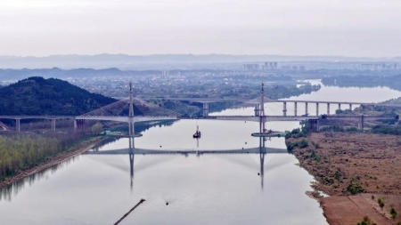 嘉陵江特大桥位于南充市顺庆区与高坪区交界处,是成达万高铁全线重难点控制性工程之一。大桥全长6830米、主跨328米,在时速350公里高铁矮塔混合梁斜拉桥中,跨度位居世界第一。