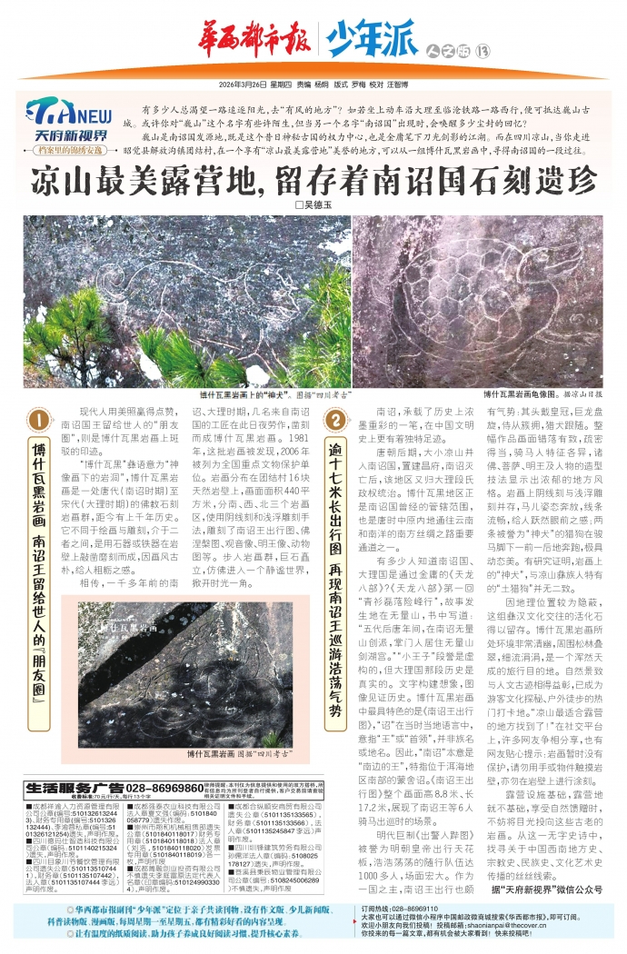巍山是南诏国发源地,既是这个昔日神秘古国的权力中心,也是金庸笔下刀光剑影的江湖。而在四川凉山,当你走进昭觉县解放沟镇团结村,在一个享有“凉山最美露营地”美誉的地方,可以从一组博什瓦黑岩画中,寻得南诏国的一段过往。