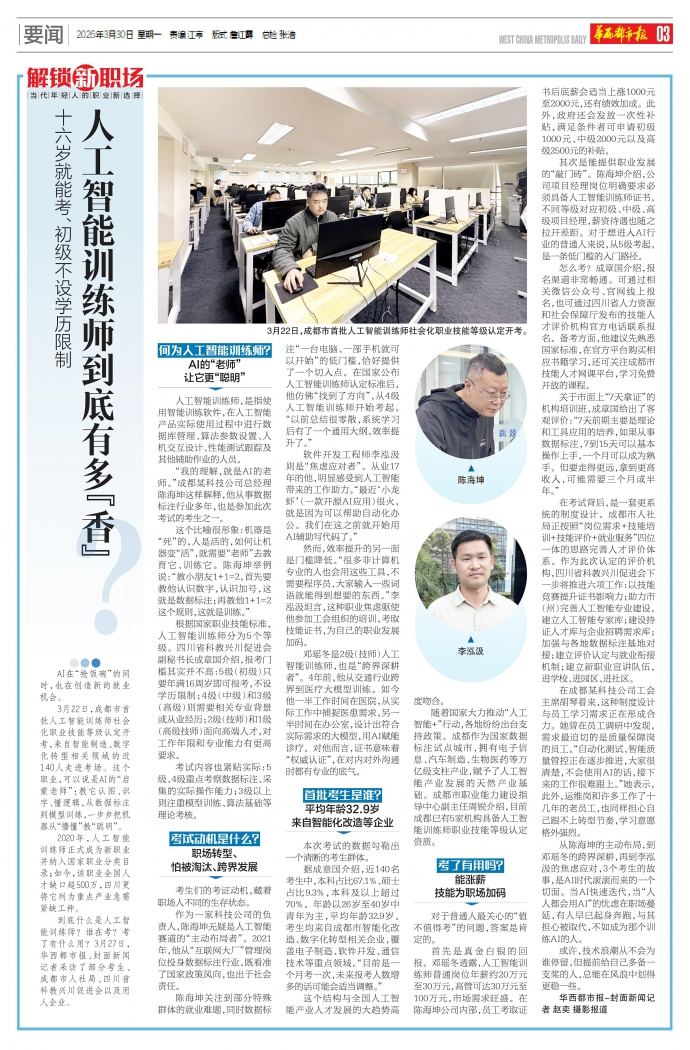 3月22日,成都市首批人工智能训练师社会化职业技能等级认定开考。