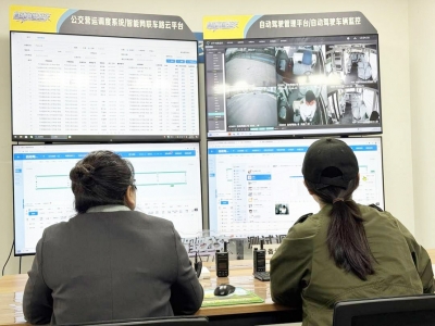 调度中心工作人员时刻监控自动驾驶公交车内外的情况。