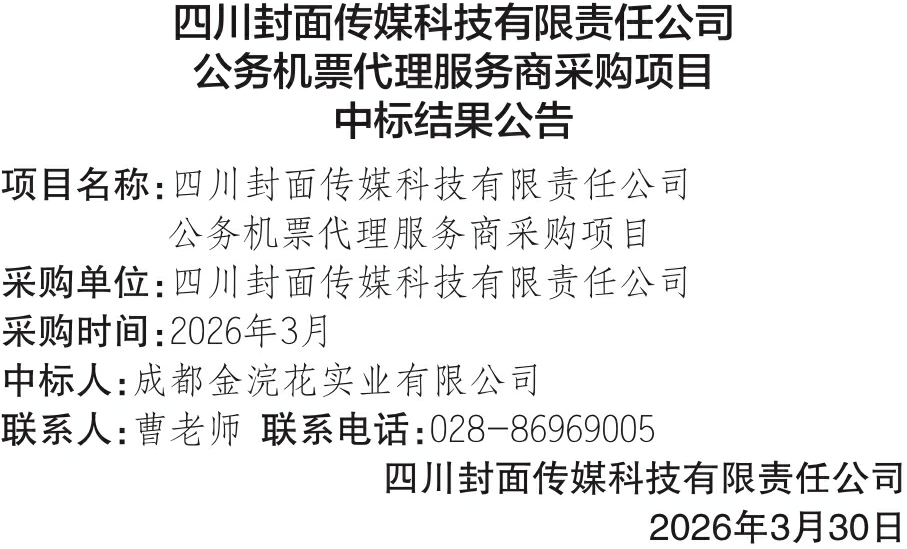 四川封面传媒有限责任公司公务机票代理服务商采购项目中标结果公告