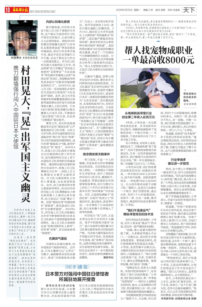 新华社东京3月29日电 据日本共同社报道,日本警方29日以涉嫌非法侵入建筑物为由,对此前因强闯中国驻日本大使馆而被逮捕的陆上自卫队三等陆尉村田晃大所属自卫队驻地及其住所展开搜查。