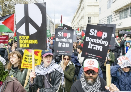 3月28日,人们在英国伦敦参加集会,抗议美国和以色列对伊朗发动军事打击。新华社发
