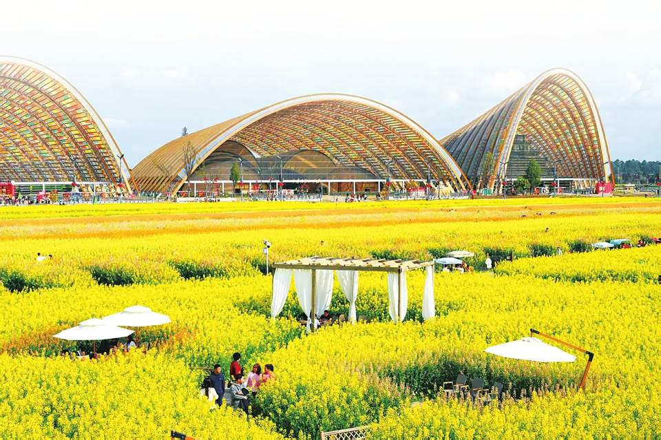 游客在成都新津区天府农博园里游览。