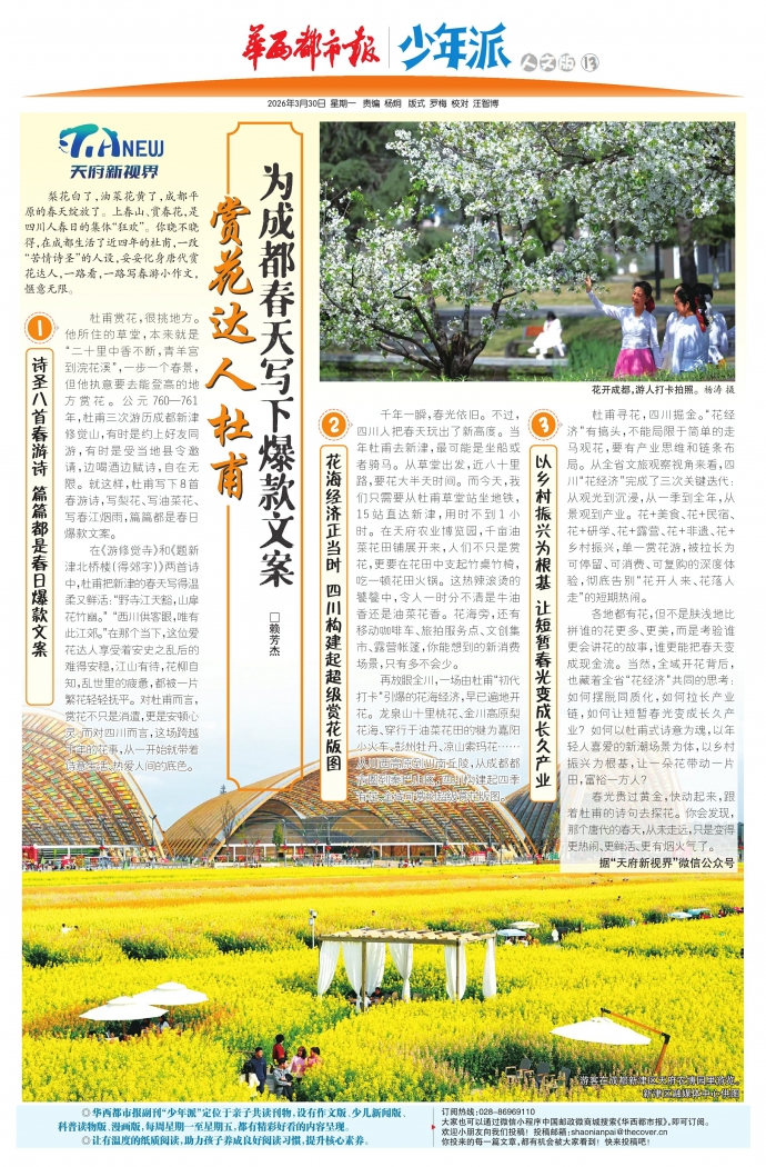 梨花白了,油菜花黄了,成都平原的春天绽放了。上春山、赏春花,是四川人春日的集体“狂欢”。你晓不晓得,在成都生活了近四年的杜甫,一改“苦情诗圣”的人设,妥妥化身唐代赏花达人,一路看,一路写春游小作文,惬意无限。