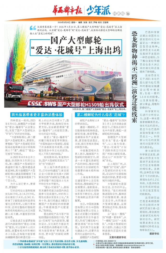 大国重器再落一子!2026年3月20日,第二艘国产大型邮轮“爱达·花城号”在上海顺利出坞。从首艘“爱达·魔都号”到“爱达·花城号”,我国再次擦亮大型邮轮这颗造船工业“皇冠上的明珠”。