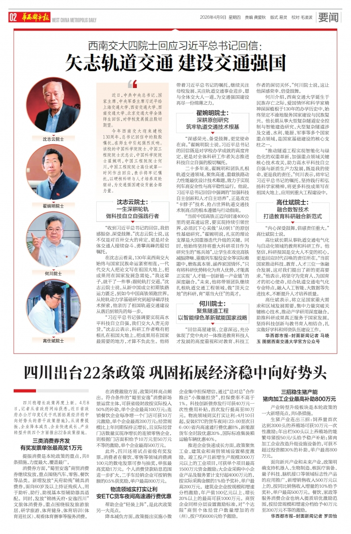 今年西南交大迎来建校130周年,总书记回信中的殷殷嘱托,在师生中引起强烈反响。该校的中国科学院院士、中国工程院院士沈志云,中国科学院院士翟婉明,中国工程院院士何川,中国工程院院士高仕斌第一时间作出回应,表示将牢记嘱托,以硬核科研与人才培养双轮驱动,为交通强国建设贡献全部力量。