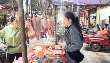 黎欢的肉摊在资阳南门市场内,上午9时许,这里人声鼎沸,其丈夫刘生麻利地切肉、称重、招呼客人,电子收款音不时响起。