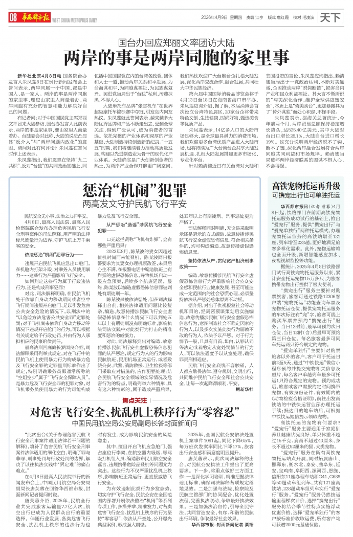 4月8日,最高人民法院、检察院联合发布办理危害民航飞行安全刑事案件的司法解释,用严明的法律标尺衡量行为边界,守护飞机上万千乘客的安全。
