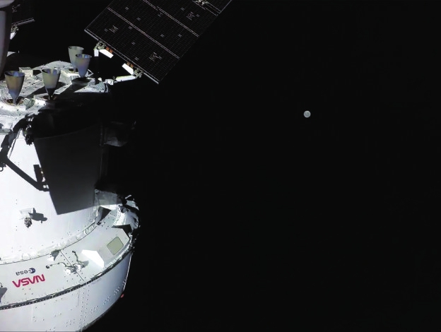 执行“阿耳忒弥斯2号”载人绕月飞行任务的“猎户座”飞船和月亮。