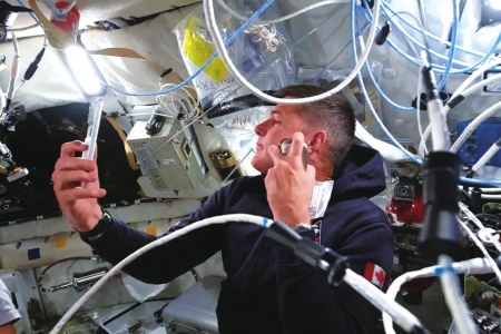 加拿大航天局宇航员杰里米·汉森在执行“阿耳忒弥斯2号”载人绕月飞行任务的“猎户座”飞船上刮胡子。