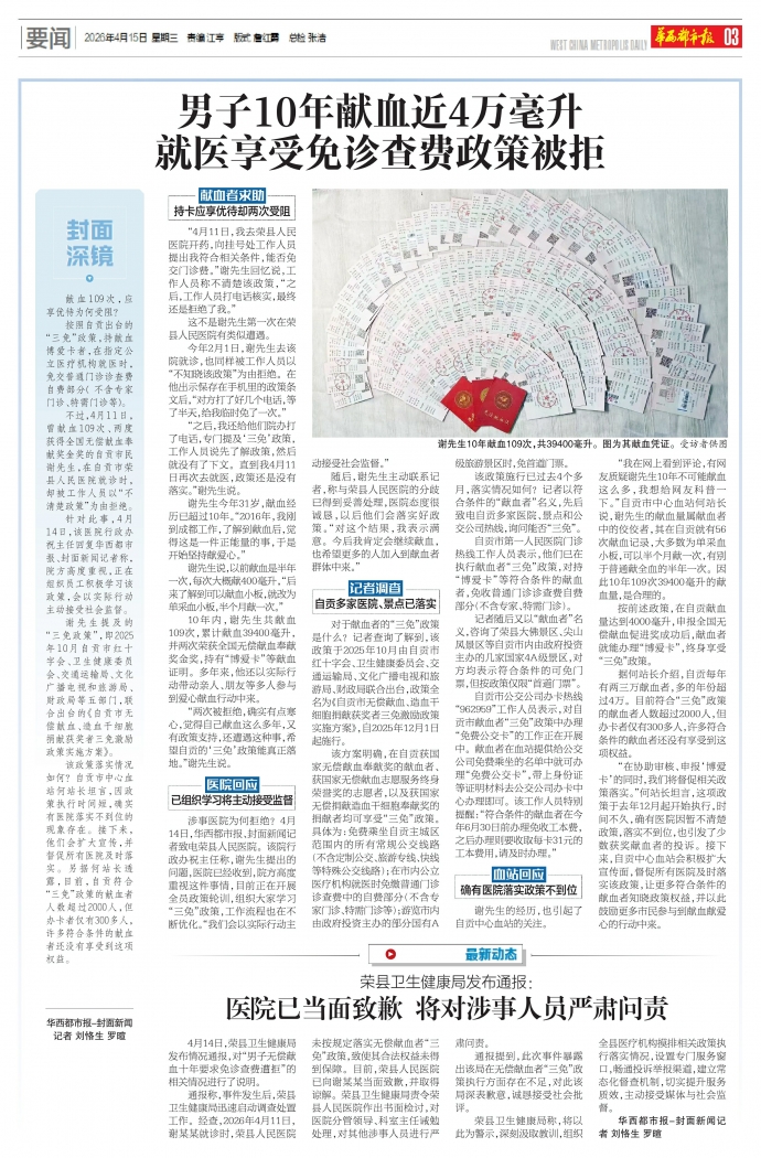 涉事医院为何拒绝?4月14日,华西都市报、封面新闻记者致电荣县人民医院。该院行政办祝主任称,谢先生提出的问题,医院已经收到,院方高度重视这件事情,目前正在开展全员政策轮训,组织大家学习“三免”政策,工作流程也在不断优化。“我们会以实际行动主动接受社会监督。”