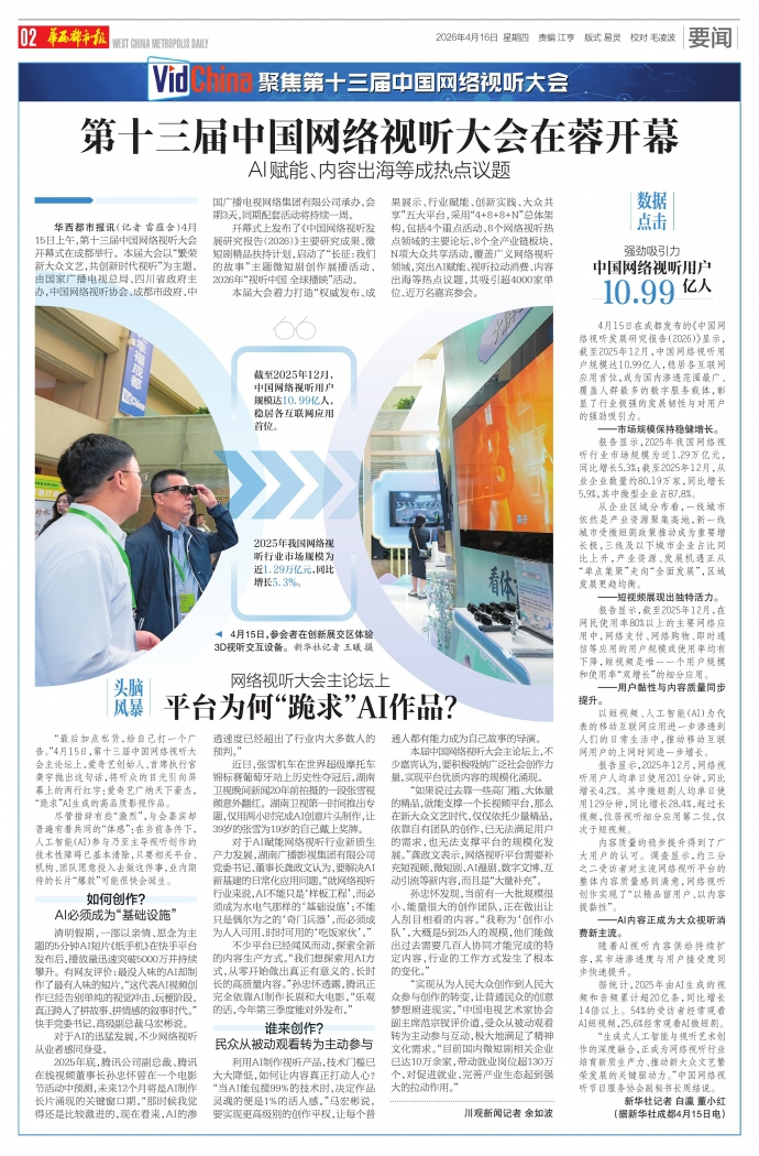 华西都市报讯(记者 雷蕴含)4月15日上午,第十三届中国网络视听大会开幕式在成都举行。本届大会以“繁荣新大众文艺,共创新时代视听”为主题,由国家广播电视总局、四川省政府主办,中国网络视听协会、成都市政府、中国广播电视网络集团有限公司承办,会期3天,同期配套活动将持续一周。