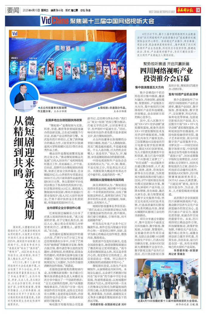 推介会重磅发布了16项四川网络视听产业机会清单,覆盖产业园区、数字版权、影视基地、数字资产、文创赛事、科幻内容、体育电竞等领域,包括星空影视共创产业园、东八区数字片场“XR+VP+光学动捕”虚拟摄制基地、西岭短剧创作拍摄基地、中国电影投融资研究院、量子艺术研究院、斑马中国数字资产运营服务平台、寻梦天宫——中国空间站数字场景开发、中国电影基金会女性电影专项基金“盛放计划”、2026成都数字版权交易博览会、AIGC剧集《太空探针》、2026光影绽放活力之夜、创动力·科技前沿动漫科幻系列、影视级AIGC制作、四川观察赛事展演票务项目、DOTA2 slam大满贯赛、“川超足球”游戏,面向全国开放合作,为企业、资本、人才提供精准对接通道。