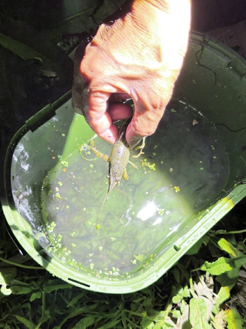 “今晚捞了10只了。”在河道中间,一位身穿连体雨裤的男子引起了记者注意,只见他头戴探照灯,身背捕鱼包,在河道里行走,河水没过膝盖,他时而俯下身,在水草里找寻小龙虾的踪迹。