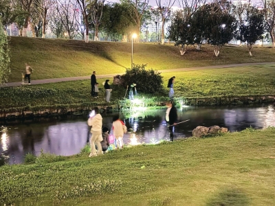 “你看嘛,这就是我前几天发在家人群里的照片,人可多了。”河道旁水无界·悦动园公园安保人员表示,前几天他在晚7点至次日7点通宵值守巡逻时,发现有人凌晨2点前来捕捞,有时凌晨5点还有人在捕捞。