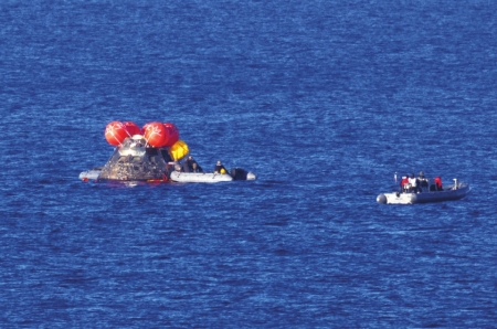 2026年4月10日,执行美国“阿耳忒弥斯2号”载人绕月飞行任务的“猎户座”飞船溅落在加利福尼亚州圣迭戈附近海域。 新华社发