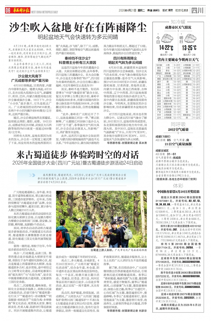 “此外,秦岭在广元附近开了个口,这就是嘉陵江河谷一带。”傅正航解释,广元嘉陵江河谷缺口是沙尘入川的“主干道”,春季强冷空气和大风时,沙尘会沿此长驱直入,先影响广元,再扩散至全盆地。