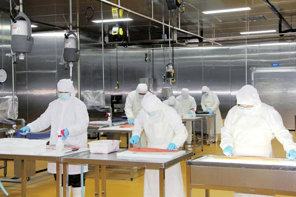 成都青羊区三文鱼加工中心流水线。本报资料图