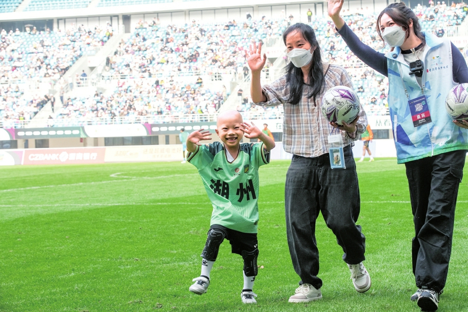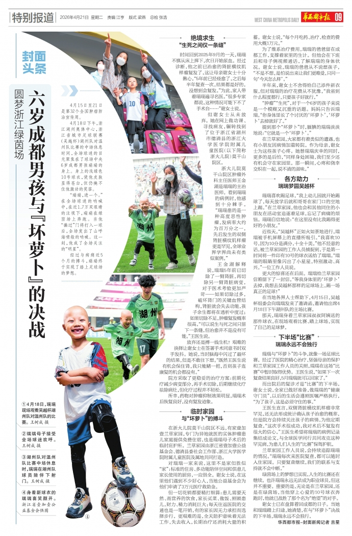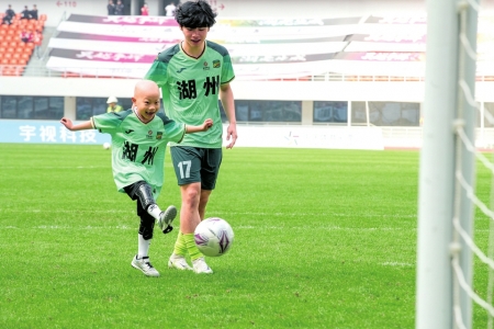 4月18日下午,浙江湖州奥体中心,浙江省城市足球联赛(吴越杯)湖州队对温州队比赛的中场休息时间,全场球迷的目光聚焦在了球场中央6岁成都男孩瑞瑞的身上。身上的浅绿色10号球衣,使他皮肤显得苍白,但仍掩不住他激动的笑容。