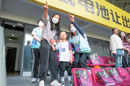 4月18日,瑞瑞现场观看吴越杯湖州队对温州队的比赛。王树成摄