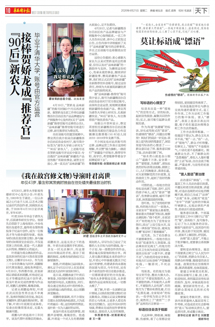 而在该账号的置顶视频中,蔡宜芮自我介绍来自新疆维吾尔自治区农业农村厅,账号简介标签为“清华大学硕士研究生”“‘90后’新农人”。上述账号还在贺娇龙账号评论区中留言:专注做好“品味新疆”新疆农产品宣传推广和助农事业,请贺主任放心,请一直关注“品味新疆”的大家放心,定不负期待。