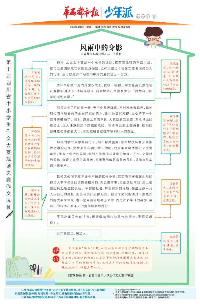 本文紧扣“担当”主题,以初三学生雨天守护破损窨井盖的小事为核心,阐释担当内涵,结构清晰、逻辑连贯。细节描写生动,环境烘托到位,从具体事例到道理阐释层层递进,既展现了少年的勇敢与责任,也传递了对担当的深刻理解,主题积极向上,情感真挚动人。