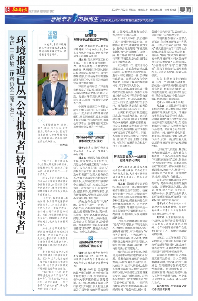 “新时代这十几年,是中国环境报道当之无愧的‘黄金十年’。”刘友宾说,行业正经历一场深刻转型——从过去的“公害批判者”,转向今天的“美丽守望者”。