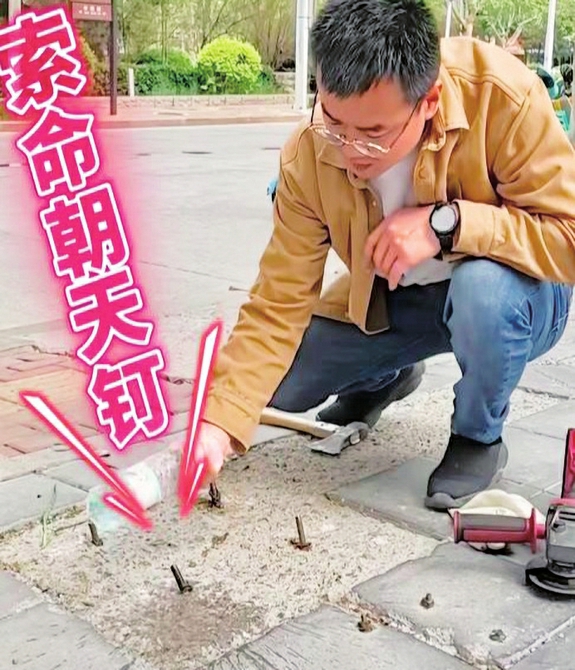 胡先生则在一处建筑工地附近,遇到了真正的“硬骨头”。地面上露出10余根钉子,埋在地下将近40厘米深。他用了三天:第一天只处理三四根;第二天换大撬棍,又磨了一个多小时;第三天咬着牙,把剩下的钉子全部清理干净。