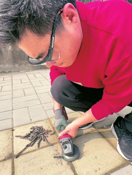 张玉帅的拔钉工具不断升级:从砖头到羊角锤,再到网购的角磨机。而真正的挑战很快出现——一个直径30厘米的不锈钢防撞柱残桩,只露出地面3厘米。“围着它转圈切,火星子溅得满胳膊都是。”那天他用了十多个切割片,蹲着忙活了大半天。他三次改装撬棍,前两次的“羊角头”都在作业中崩断,最终版撬棍专门适配拔掉路面的膨胀螺丝。
