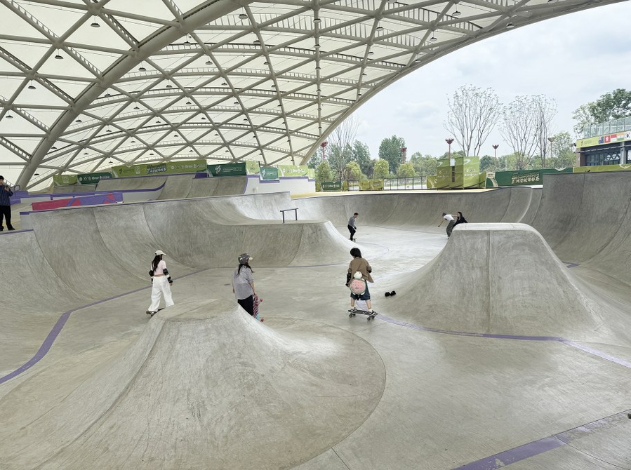 ▲滑板爱好者们在中国·眉山时尚运动公园体验新场地。