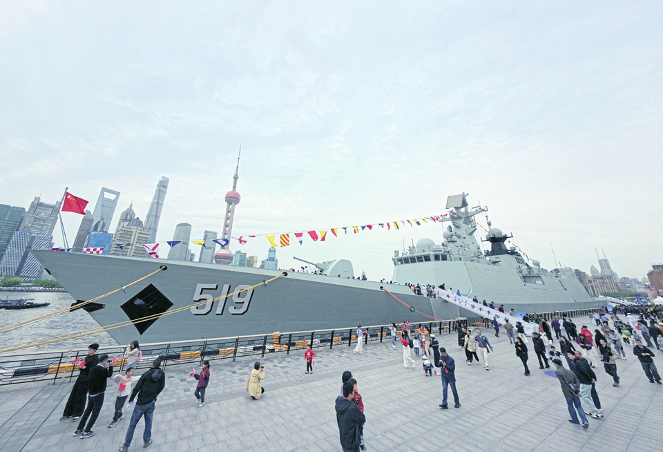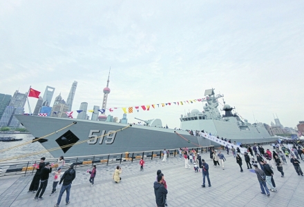 停泊在上海港国际客运中心码头的海军阜阳舰(4月21日摄)。