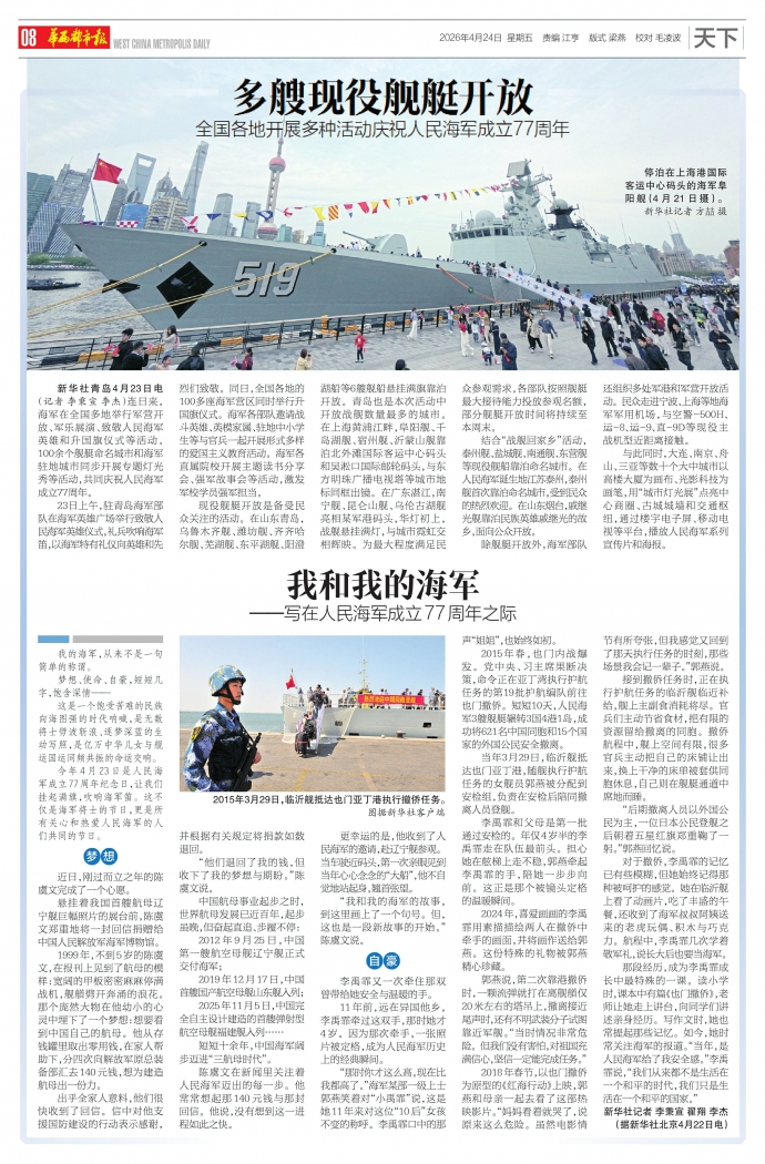 新华社青岛4月23日电(记者 李秉宣 李杰)连日来,海军在全国多地举行军营开放、军乐展演、致敬人民海军英雄和升国旗仪式等活动,100余个舰艇命名城市和海军驻地城市同步开展专题灯光秀等活动,共同庆祝人民海军成立77周年。
