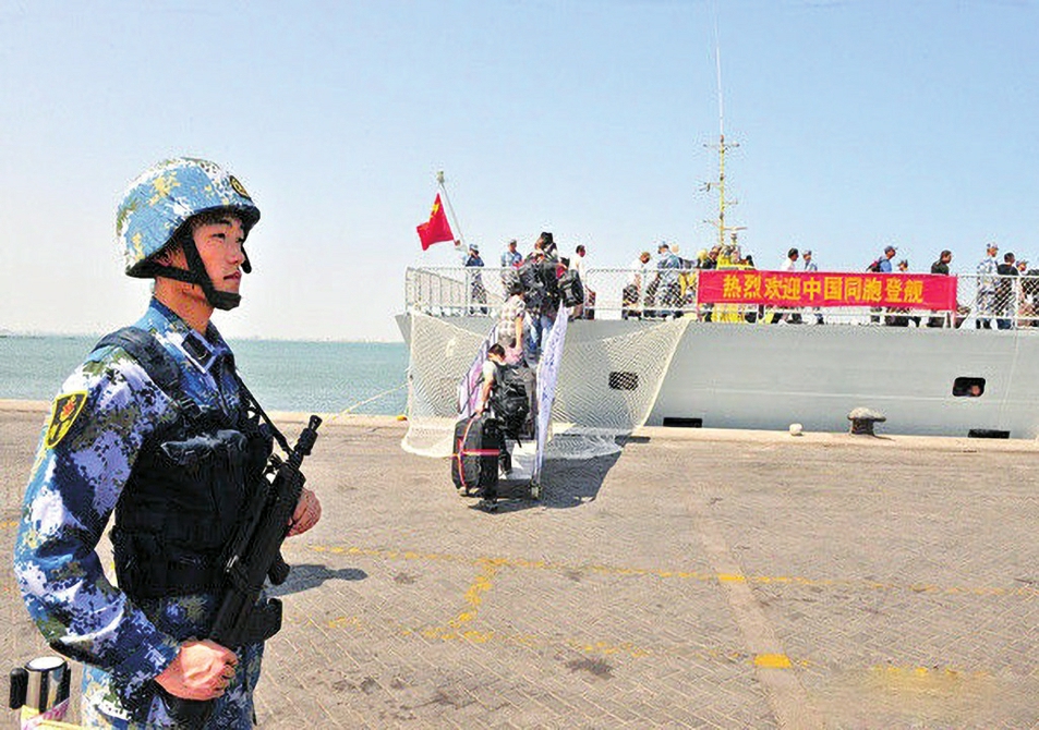 2015年春,也门内战爆发。党中央、习主席果断决策,命令正在亚丁湾执行护航任务的第19批护航编队前往也门撤侨。短短10天,人民海军3艘舰艇辗转3国4港1岛,成功将621名中国同胞和15个国家的外国公民安全撤离。
