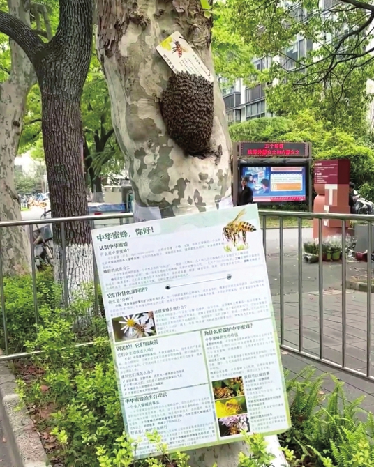 等待,并不是什么都不做。当天下午,后勤工作人员就在树干上贴了两张“请勿靠近”的提醒,同时拉起了安全线。郭光普则每隔一段时间,从办公室步行5分钟到这棵悬铃木旁,看看蜜蜂的状态,也看看学生们是否被困扰。