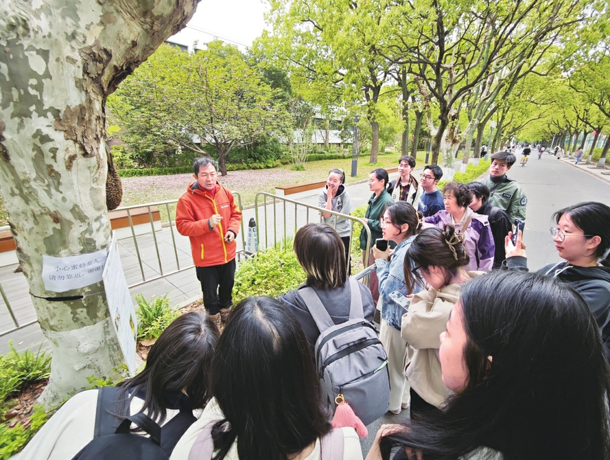 最近,同济大学大学生活动中心附近的一棵悬铃木成了路过学生的“临时课堂”。