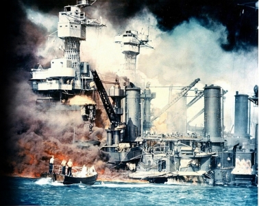 这是1941年12月7日珍珠港事件发生时美国战舰被轰炸后的资料照片。图据新华社客户端