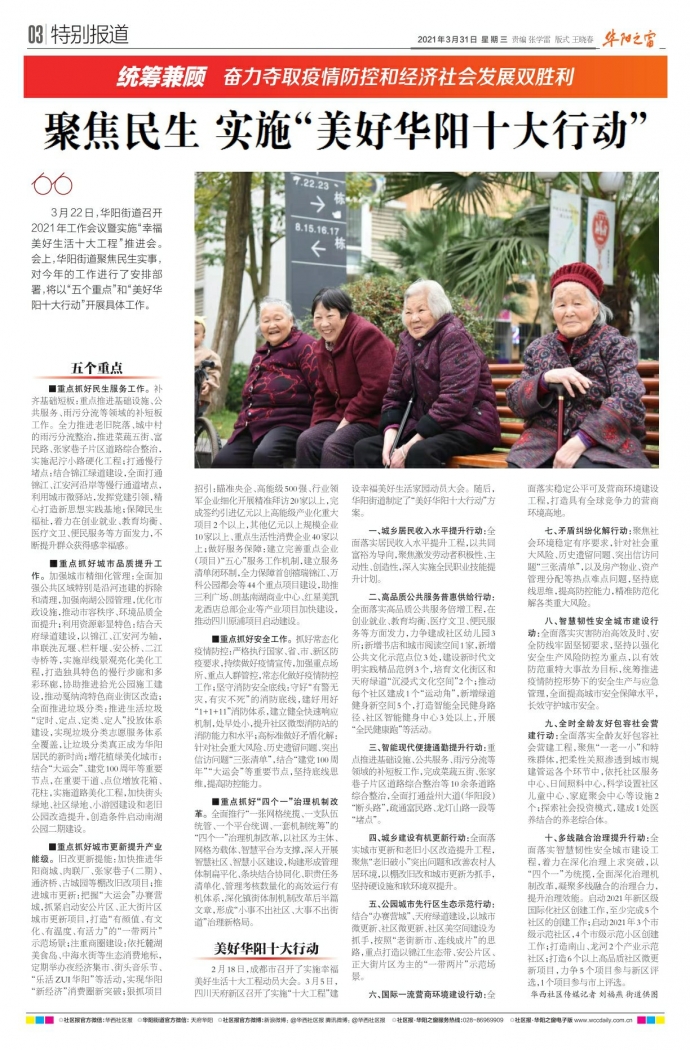 3月22日,华阳街道召开 2021年工作会议暨实施“幸福美好生活十大工程”推进会。会上,华阳街道聚焦民生实事,对今年的工作进行了安排部署,将以“五个重点”和“美好华阳十大行动”开展具体工作。