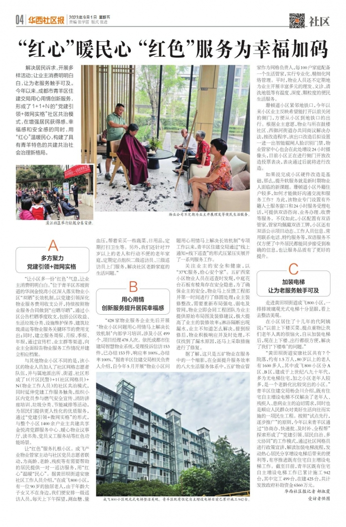 解决居民诉求,开展多样活动;让业主消费明明白白,让为老服务触手可及。今年以来,成都市青羊区住建交局用心用情创新服务,形成了1+1+N的“党建引领+微网实格”社区共治模式,在增强居民获得感、幸福感和安全感的同时,用“红心”温暖民心,构建了具有青羊特色的共建共治社会治理新格局。