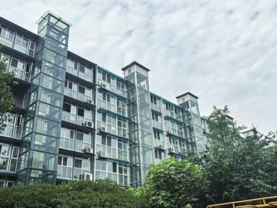 成飞800小区观光式电梯整洁美观。青羊区既有住宅自主增设电梯目前已累计施工942台。