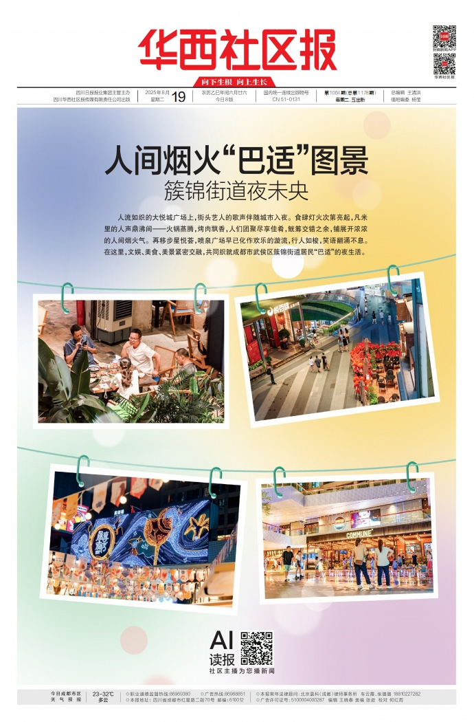 人流如织的大悦城广场上,街头艺人的歌声伴随城市入夜。食肆灯火次第亮起,凡米里的人声鼎沸间——火锅蒸腾,烤肉飘香,人们团聚尽享佳肴,觥筹交错之余,铺展开浓浓的人间烟火气。再移步星悦荟,喷泉广场早已化作欢乐的漩流,行人如梭,笑语翻涌不息。在这里,文娱、美食、美景紧密交融,共同织就成都市武侯区簇锦街道居民“巴适”的夜生活。
