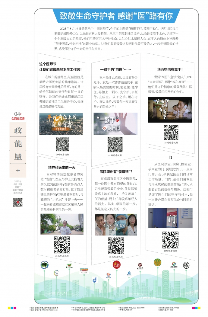 2025年8月19日是第八个中国医师节,今年的主题是“德馨于行,技精于勤”。华西社区报用笔墨记录医者仁心,以光影定格大爱瞬间。从三甲医院到社区诊所,从急诊室到手术台,记录下一个个温暖人心的故事,他们用精湛医术守护生命,以仁心仁术温暖人心,在平凡的岗位上诠释着“健康所系,性命相托”的职业信仰。让我们共同致敬这些新时代最可爱的人,一起走进医者的世界,感受那份守护生命的责任与担当。