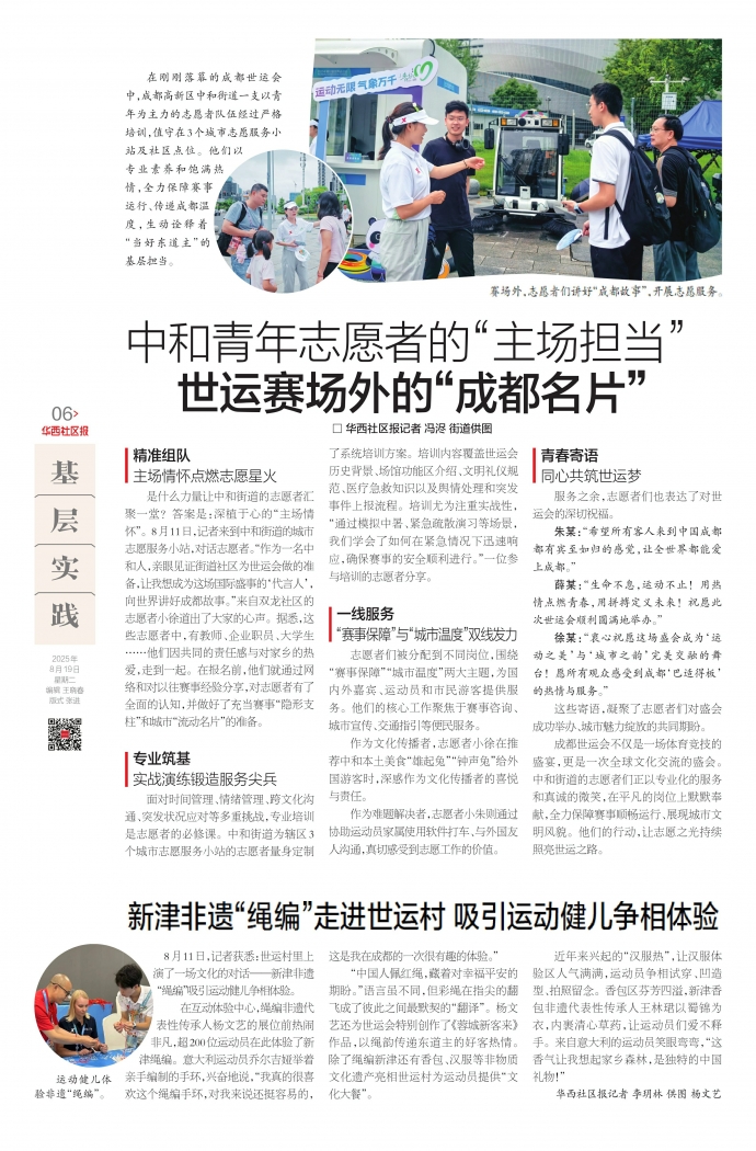 在刚刚落幕的成都世运会中,成都高新区中和街道一支以青年为主力的志愿者队伍经过严格培训,值守在3个城市志愿服务小站及社区点位。他们以专业素养和饱满热情,全力保障赛事运行、传递成都温度,生动诠释着“当好东道主”的基层担当。