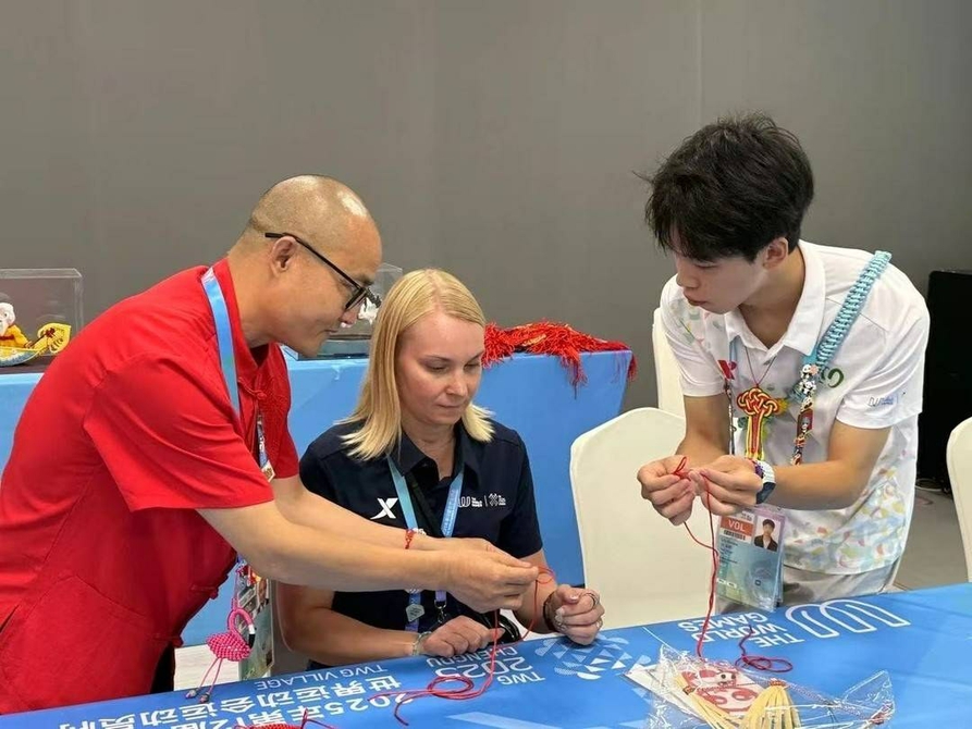 “中国人佩红绳,藏着对幸福平安的期盼。”语言虽不同,但彩绳在指尖的翻飞成了彼此之间最默契的“翻译”。杨文艺还为世运会特别创作了《蓉城新客来》作品,以绳韵传递东道主的好客热情。除了绳编新津还有香包、汉服等非物质文化遗产亮相世运村为运动员提供“文化大餐”。
