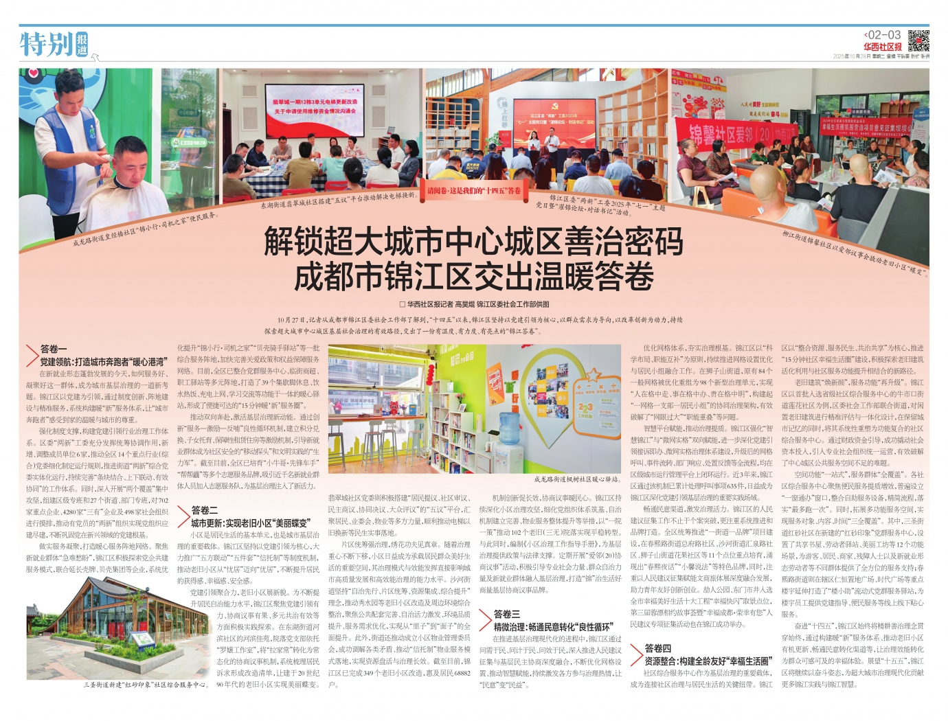 10月27日,记者从成都市锦江区委社会工作部了解到,“十四五”以来,锦江区坚持以党建引领为核心,以群众需求为导向,以改革创新为动力,持续探索超大城市中心城区基层社会治理的有效路径,交出了一份有温度、有力度、有亮点的“锦江答卷”。