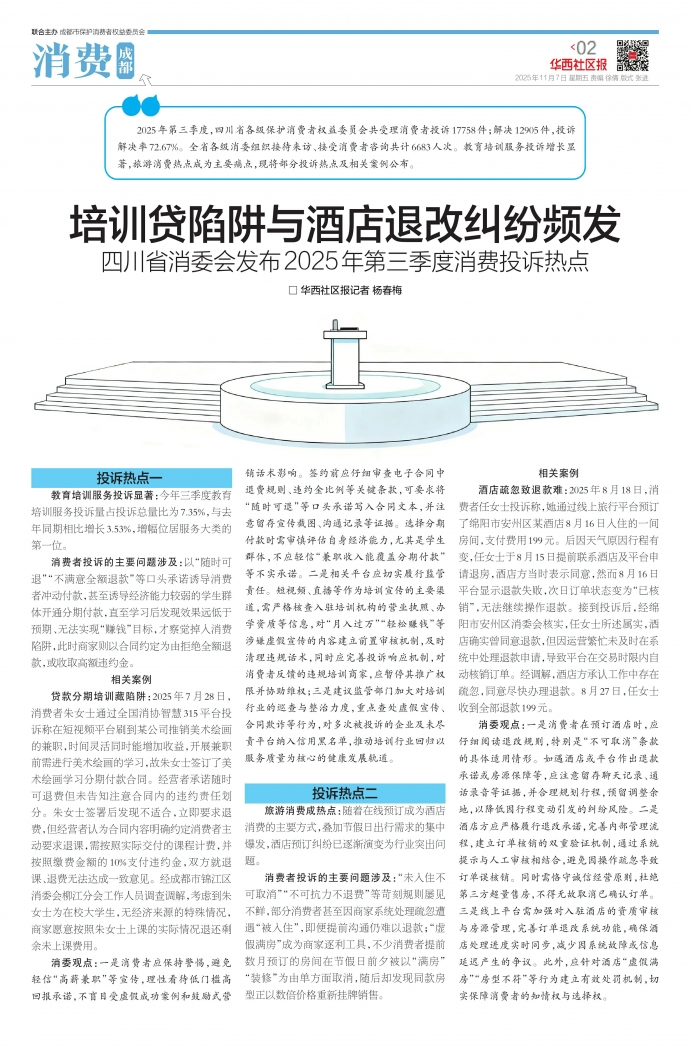 2025年第三季度,四川省各级保护消费者权益委员会共受理消费者投诉17758件;解决12905件,投诉解决率72.67%。全省各级消委组织接待来访、接受消费者咨询共计6683人次。教育培训服务投诉增长显著,旅游消费热点成为主要痛点,现将部分投诉热点及相关案例公布。
