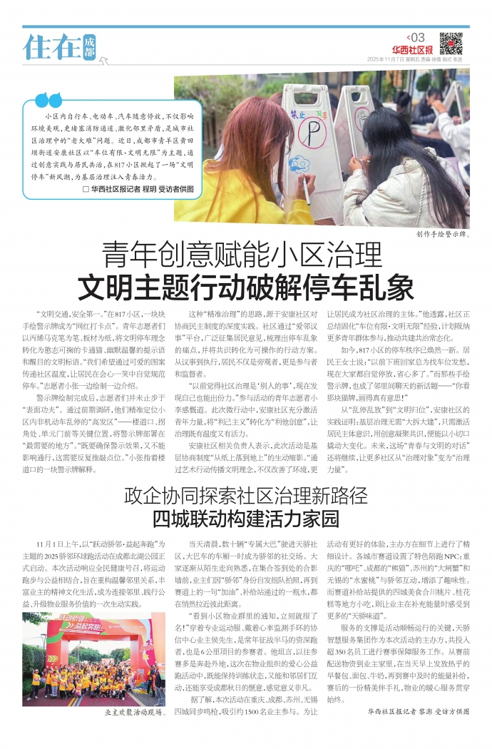 小区内自行车、电动车、汽车随意停放,不仅影响环境美观,更堵塞消防通道、激化邻里矛盾,是城市社区治理中的“老大难”问题。近日,成都市青羊区黄田坝街道安康社区以“车位有限·文明无限”为主题,通过创意实践与居民共治,在817小区掀起了一场“文明停车”新风潮,为基层治理注入青春活力。