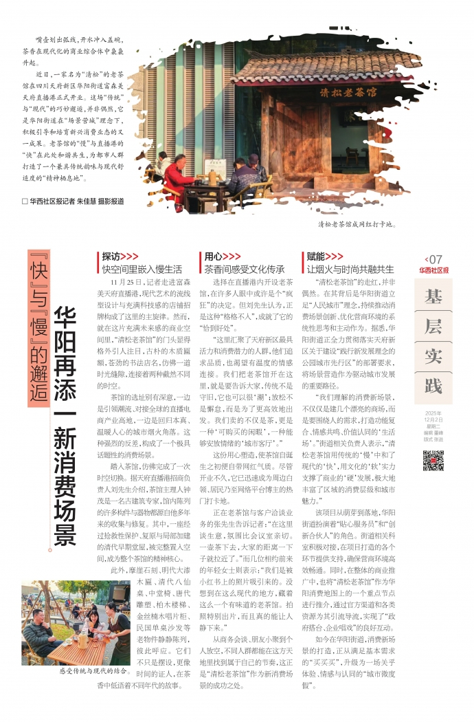 “我们理解的消费新场景,不仅仅是建几个漂亮的商场,而是要围绕人的需求,打造功能复合、情感共鸣、价值认同的‘生活场’。”街道相关负责人表示,“清松老茶馆用传统的‘慢’中和了现代的‘快’,用文化的‘软’实力支撑了商业的‘硬’发展,极大地丰富了区域的消费层级和城市魅力。”
