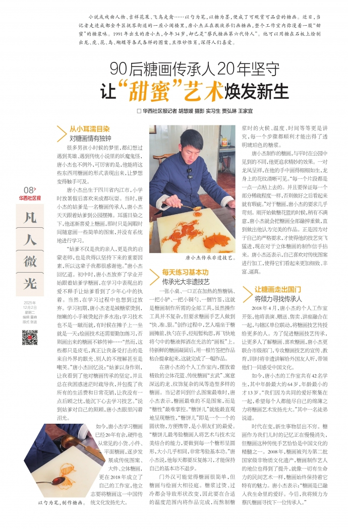 小说或戏曲人物、吉祥花果、飞鸟走禽……以勺为笔,以糖为墨,便成了可观赏可品尝的糖画。近日,当记者走进成都金牛区抚琴街道的一座小阁楼里,唐小杰正在教徒弟们画糖画,整个工作室内弥漫着一股“甜蜜”的糖浆味。1991年出生的唐小杰,今年34岁,却已是“蔡氏糖画第六代传人”。他可以用糖在石板上绘制出龙、虎、花、鸟、蝴蝶等各式各样的图案,且惟妙惟肖,深得人们喜爱。