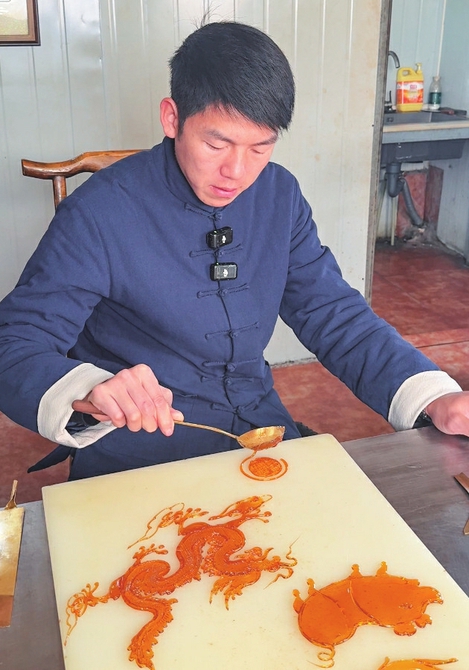 如今,唐小杰学习糖画已经20年有余,硬件也从常见的小货、小件、平面糖画,逐步发展成传统图案、大件、立体糖画,更在2018年成立了自己的工作室,他立志要将糖画这一中国传统文化发扬光大。